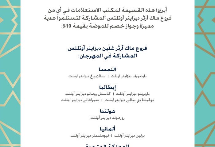 ويمكن للضيوف العرب خلال مهرجان حياكم إبراز قسيمة خاصة (اضغط هنا لتحميل القسيمة) لدى مكاتب الاستعلامات في أي فرع من فروع مكارثرغلن المشاركة في المهرجان ليستلموا هدية مميزة وبطاقة خصم على الموضة بقيمة 10 في المئة. ومن المعروف عن مراكز الأوتليت التابعة لمكارثر غلن أنها تزخر بالماركات العالمية الشهيرة وتتميز بتصاميم معمارية جميلة وبأجواء فريدة وتحتوي على مرافق متنوعة تجذب كافة أفراد العائلة.