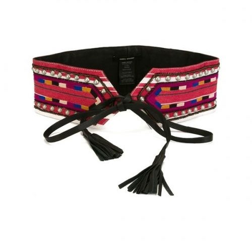 وأوضحت المجلة المعنية بالموضة والجمال أن الحزام الفلكلوري يأتي مرصعاً بالحليات ويمتاز بألوانه الزاهية اللافتة للأنظار، ويتم ربطه إما على شكل عقدة أو فيونكة.