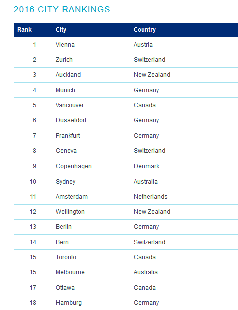 وتبعاً لذلك فان سبعة من المدن الالمانية احتلت مراتب متقدمة ضمن افضل خمسة وعشرون مدينة للحياة في العالم.