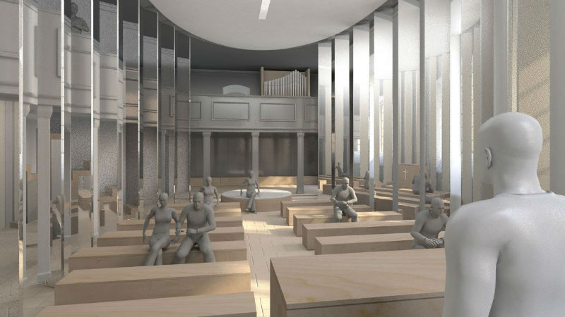 أعاد المهندس المعماري والمصمم مايكل جيه براون تصميم الكنيسة مقابل نحو 200 ألف دولار ووضع 30 ريشة من الخزف الفني المتدلي من السقف.