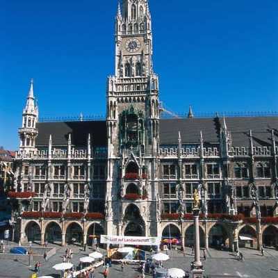 يتمتع هذا المبنى بالطراز المعماري القوطي الحديث. ويتميز بأجراسه الكثيرة التي تدق عند الساعة الحادية عشر أو الثانية عشر وكذلك الساعة الخامسة مساءاً في الصيف، فتجذب انتباه المارة. كما يتميز هذا المبنى أيضاً بمجموعة التماثيل التي تدور على ارتفاع 85 متراً. وعلى مقربة منه يقع مبنى البلدية القديم ذو الطراز المعماري القوطي والذي لا يقل عن مبنى البلدية الجديد جمالاً أو فخامة.