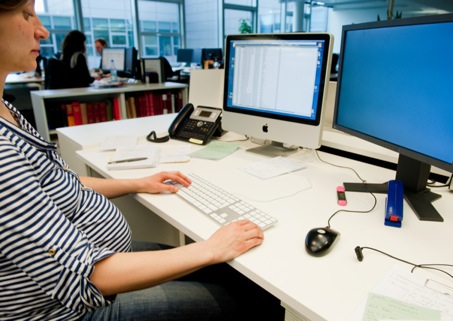 تُعد آلام الظهر من أكثر المشاكل التي تواجه المرأة الحامل أثناء العمل المكتبي، لاسيما بفعل الجلوس لمدة طويلة. وأوضح طبيب أمراض النساء الألماني كريستيان ألبرينغ :"غالباً ما ترجع الإصابة بهذه المتاعب إلى اتخاذ المرأة الحامل لوضعية جلوس منحنية إلى الأمام بسبب كبر حجم بطنها".