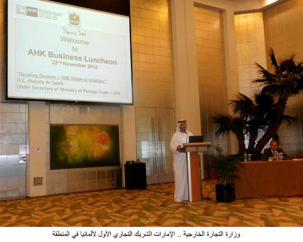 اكد سعادة عبد الله آل صالح وكيل وزارة التجارة الخارجية أن الإمارات تعد حاليا الشريك التجاري الأول لألمانيا في منطقة الشرق الأوسط والخليج.