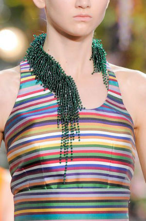 وأضافت "إيلي" أن موضة الحُلي هذا العام تستوحي إكسسوارات نساء قبائل الماساي الأفريقية وقبائل الهنود الحمر؛ حيث توجد مثلاً قلائد تلتف حول العنق كأفرع النباتات المتسلقة، وريش طويل يزين المعصم وأطواق للرقبة إلى جانب الحُلى الضخمة التي تزدان بالنقوش القبائلية كأقنعة الموتي.