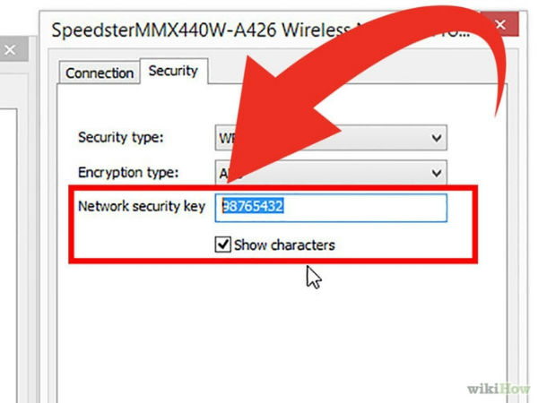 وبعد ذلك يتم الذهاب إلى بند (Wireless Network Properties)، ثم اختيار علامة التبويب (Security) وتفعيل الخيار (Show Characters) تحت بند (Network Security key) . وعندئذ يتم إظهار كلمة المرور الخاصة بشبكة WLAN اللاسلكية.