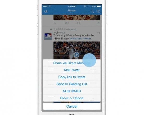 وكي يتمكن المستخدم من إجراء محادثة جماعية يتعين عليه في البداية إنشاء تغريدة خاصة بذلك عن طريق اختيار بند مشاركة عبر رسالة مباشرة (Share via Direct Message) الموجود في القائمة أسفل الثلاث نقاط.
