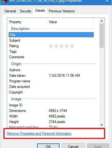 ويتمكن المستخدم من حذف هذه البيانات في بيئة عمل نظام تشغيل مايكروسوفت ويندوز بكل سهولة من خلال النقر على الزر الأيمن للفأرة، ثم تحديد الخيار "خصائص"، وبعد ذلك يتم تحديد المعلومات المعينة المراد حذفها، أو يمكنه النقر على بند "إزالة الخصائص والمعلومات الشخصية".