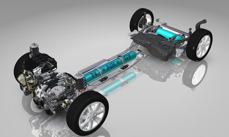ويشتمل نظام الدفع الهجين Hybrid Air على العديد من المكونات الأساسية، منها خزان كبير للهواء المضغوط سعة حوالي 20 لتراً مركب في النفق الأوسط بالسيارة، مضخة ومحرك يتم إدارته بالطاقة الهيدروليكية. ويتصل هذا المحرك بمحرك بنزين ثلاثي الأسطوانات عن طريق ناقل حركة تقليدي.