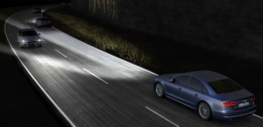 وتؤكد الشركة الألمانية أن قيادة سيارة الصالون الفارهة ستكون أكثر أمناً أثناء الليل في المستقبل بفضل تجهيزها بكشافات ماتريكس المتطورة. وتعتبر السيارة A8 الجديدة أول موديل قياسي يتم تجهيزه بهذا النوع من الكشافات الأمامية المتطورة.