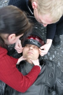ويجب نقل قائد الدراجة النارية المُصاب إلى مكان آمن على حافة الطريق بواسطة قبضة الإنقاذ، حيث يتم رفع الجزء العلوي من جسم المُصاب قليلاً، حتى يتمكن المُسعف من إدخال يديه أسفل إبط المُصاب، وبعد ذلك يُمسك بكلتا يديه ساعد المُصاب، بحيث يكون الساعد موضوعاً بشكل عرضي أمام صدر المُصاب.