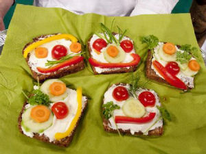 ويمكن تشكيل وجه على شريحة الخبز من خلال وضع قطع الجبن الطازجة قليلة الدهون أو شرائح اللحم عليه، ثم وضع شرائح الخيار أو الجزر أو الطماطم بعد ذلك لرسم العيون، ثم وضع شريحة من الفلفل الأحمر لرسم الفم. ولرسم الأنف يمكن وضع شريحة من الطماطم أو الجزر أو الخيار.