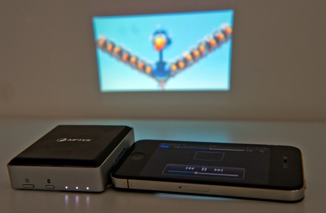 ومع ذلك يتمكن المستخدم من إنشاء اتصال بين بروجيكتور الجيب وأجهزة التشغيل بدون كابلات، ويقول رولاند شتيله :"للحصول على دقة وضوح عالية يلزم استعمال منفذ HDMI، ولكن نقل الإشارة لاسلكياً عبر تقنية البلوتوث يُسهل من عملية التشغيل بطبيعة الحال". وتشتمل باقة التجهيزات القياسية بجميع الهواتف الذكية أو الحواسب اللوحية أو أجهزة اللاب توب الحديثة تقريباً على تقنية البلوتوث.