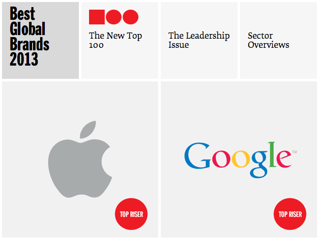 قدر التقرير قيمة علامة آبل بحوالي 3ر98 مليار دولار بزيادة قدرها 5 مليارات دولار تقريبا عن قيمة جوجل فيما جاءت علامة كوكاكولا في المركز الثالث بقيمة 2ر79 مليار دولار. وفي المركز الرابع جاءت علامة آي.بي.إم وجاءت مايكروسوفت في المركز الخامس بقيمة 5ر59 مليار دولار.