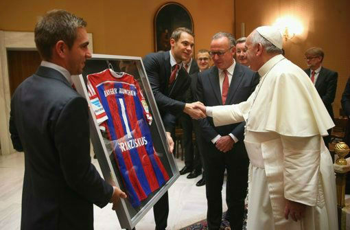 استقبل البابا فرنسيس بابا الفاتيكان لاعبي فريق بايرن ميونيخ الألماني لكرة القدم اليوم الأربعاء في مقابلة خاصة بالفاتيكان بعد يوم واحد من الفوز الكاسح 7/1 الذي حققه بايرن على فريق روما الإيطالي مساء أمس الثلاثاء في دوري أبطال أوروبا.