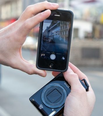 بفضل التطور التكنولوجي الهائل باتت الهواتف الذكية تشكل منافساً شرساً للكاميرات المدمجة؛ حيث تأتي الهواتف الحديثة مزودة بكاميرات ذات جودة تضاهي الكاميرات المدمجة منخفضة التكلفة. لذا يتوقع بعض الخبراء بأن تكتب الهواتف الذكية فصل النهاية للكاميرات المدمجة قريباً، في حين يرى آخرون أن الكاميرات المدمجة تتفوق على كاميرات الهواتف الذكية ببعض المزايا التي ستكتب لها النجاة.